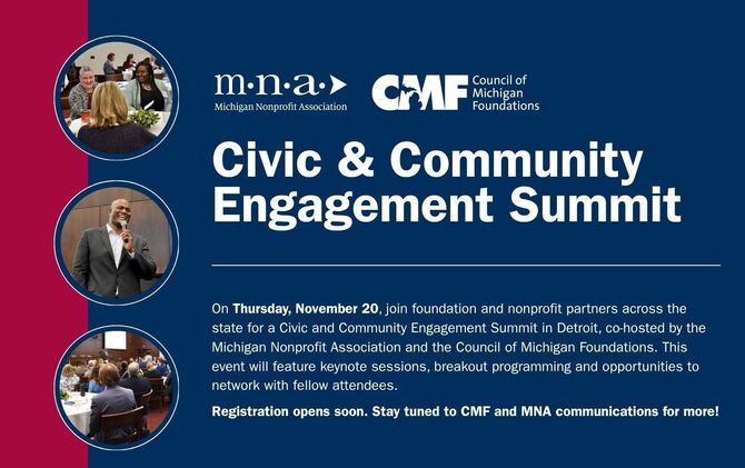 Michigan Nonprofit Association (MNA) and the Council of Michigan Foundations (CMF) will host a Civic and Community Engagement Summit in Detroit, Michigan. This gathering comes at a time when civil society is under increased scrutiny, with threats to civic engagement, increased polarization, and mounting risks to democratic norms creating real fears—especially among vulnerable communities. The summit will provide space for nonprofit and philanthropic leaders to reflect on the threats to civic engagement and action while exploring the opportunities we share to shape a collective future where all can thrive