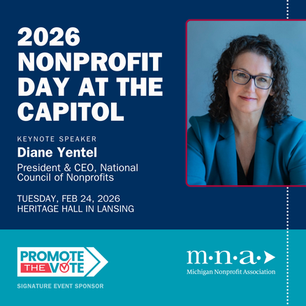 MNA’s annual policy and advocacy event, Nonprofit Day at the Capitol, is scheduled for Tuesday, February 24, 2026, at Heritage Hall in Lansing. The keynote speaker is Diane Yentel, President & CEO of the National Council of Nonprofits.